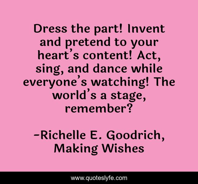 This page presents the quote "Dress the part! Invent and pretend to your heart’s content! Act, sing, and dance while everyone’s watching! The world’s a stage, remember?". Author of this quote is Richelle E. Goodrich, Making Wishes. This quote is about be, dance, richelle-e-goodrich, pretend, perform, richelle, act, richelle-goodrich, sing,.
