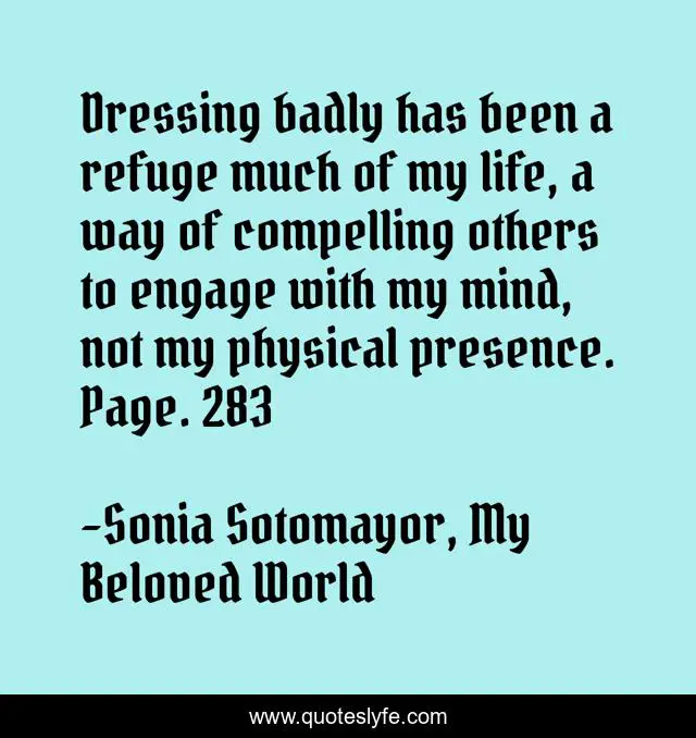 This page presents the quote "Dressing badly has been a refuge much of my life, a way of compelling others to engage with my mind, not my physical presence. Page. 283". Author of this quote is Sonia Sotomayor, My Beloved World. This quote is about respect, mind, women,.