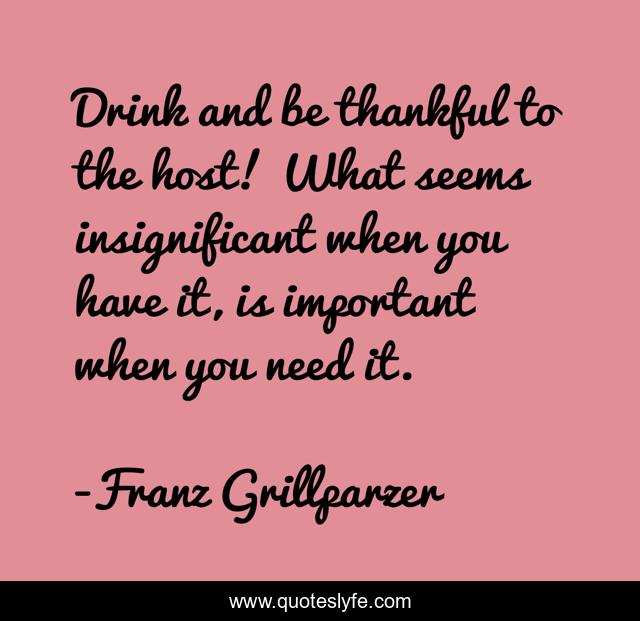 This page presents the quote "Drink and be thankful to the host! What seems insignificant when you have it, is important when you need it.". Author of this quote is Franz Grillparzer. This quote is about be thankful, thanksgiving,.