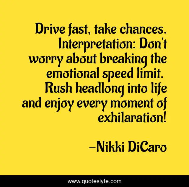 This page presents the quote "Drive fast, take chances. Interpretation: Don't worry about breaking the emotional speed limit. Rush headlong into life and enjoy every moment of exhilaration!". Author of this quote is Nikki DiCaro. This quote is about enjoyment, emotional, exhilaration, inspirational-attitude,.