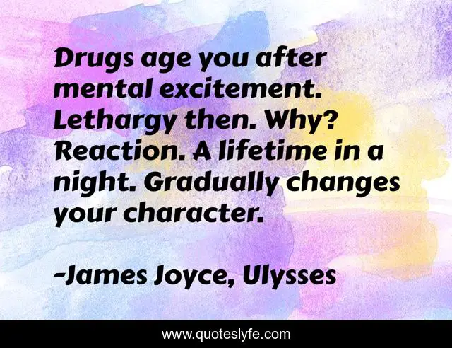This page presents the quote "Drugs age you after mental excitement. Lethargy then. Why? Reaction. A lifetime in a night. Gradually changes your character.". Author of this quote is James Joyce, Ulysses. .