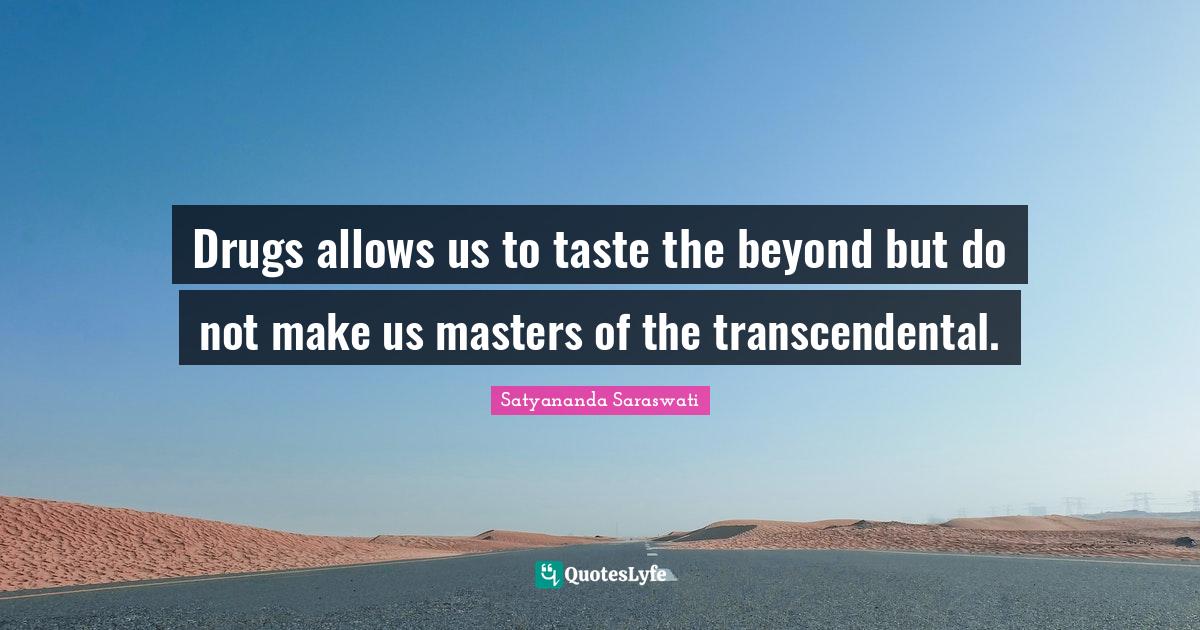 This page presents the quote "Drugs allows us to taste the beyond but do not make us masters of the transcendental.". Author of this quote is Satyananda Saraswati. This quote is about transcendental, masters, drug, taste, psychedelic,.