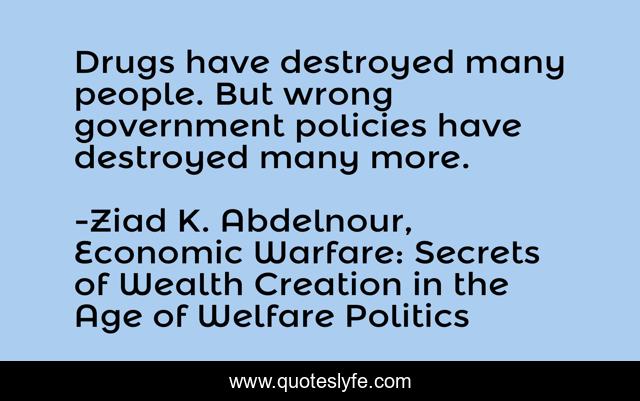 This page presents the quote "Drugs have destroyed many people. But wrong government policies have destroyed many more.". Author of this quote is Ziad K. Abdelnour, Economic Warfare: Secrets of Wealth Creation in the Age of Welfare Politics. This quote is about destroyed, drugs, government-policies,.