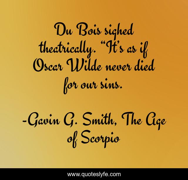This page presents the quote "Du Bois sighed theatrically. “It’s as if Oscar Wilde never died for our sins.". Author of this quote is Gavin G. Smith, The Age of Scorpio. .