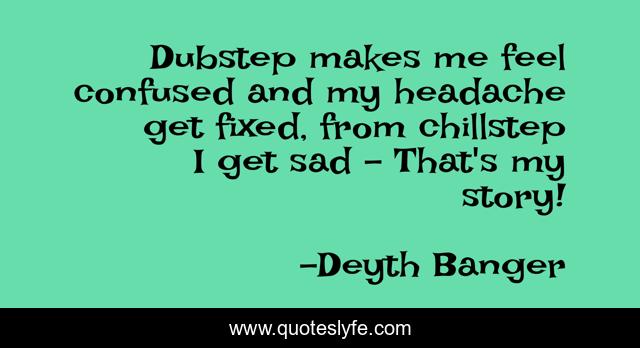 This page presents the quote "Dubstep makes me feel confused and my headache get fixed, from chillstep I get sad - That's my story!". Author of this quote is Deyth Banger. This quote is about story, from, get, dubstep, fixed, my, chillstep,.