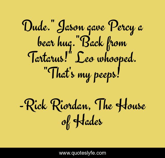 This page presents the quote "Dude." Jason gave Percy a bear hug."Back from Tartarus!" Leo whooped. "That's my peeps!". Author of this quote is Rick Riordan, The House of Hades. This quote is about jason-grace, rick-riordan, percy-jackson, leo-valdez, the-house-of-hades, heroes-of-olympus,.