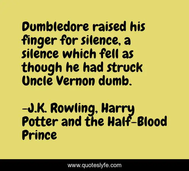 This page presents the quote "Dumbledore raised his finger for silence, a silence which fell as though he had struck Uncle Vernon dumb.". Author of this quote is J.K. Rowling, Harry Potter and the Half-Blood Prince. This quote is about power, j-k-rowling, awesome, dumbledore, authority, uncle-vernon, harry-potter,.
