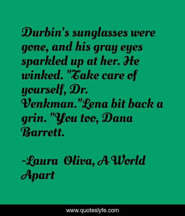 "Laura Oliva, A World Apart Quotes." Quoteslyfe.com, 2025. Sun. 07 Dec. 2025. <https://www.quoteslyfe.com/quote/Durbin-s-sunglasses-were-gone-and-his-232237>.