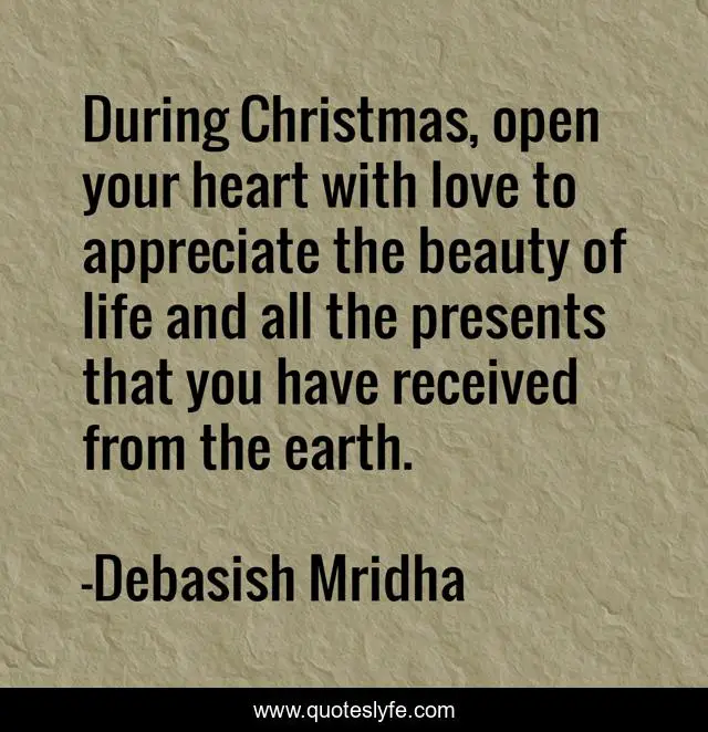 This page presents the quote "During Christmas, open your heart with love to appreciate the beauty of life and all the presents that you have received from the earth.". Author of this quote is Debasish Mridha. This quote is about love, debasish-mridha, philosophy, appreciate, quotes, debasish-mridha-md, inspirational, presents-from-earth, enthusiasm,.