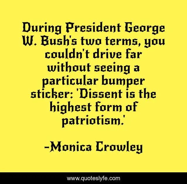 This page presents the quote "During President George W. Bush's two terms, you couldn't drive far without seeing a particular bumper sticker: 'Dissent is the highest form of patriotism.'". Author of this quote is Monica Crowley. This quote is about president, drive,.