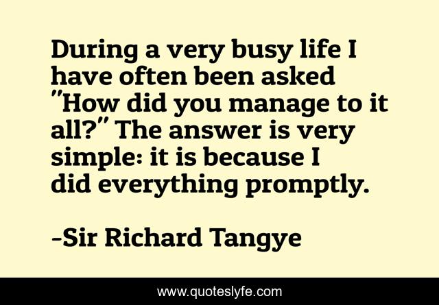 This page presents the quote "During a very busy life I have often been asked "How did you manage to it all?" The answer is very simple: it is because I did everything promptly.". Author of this quote is Sir Richard Tangye. This quote is about day, one,.