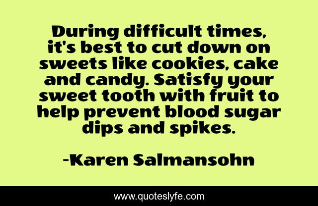 This page presents the quote "During difficult times, it's best to cut down on sweets like cookies, cake and candy. Satisfy your sweet tooth with fruit to help prevent blood sugar dips and spikes.". Author of this quote is Karen Salmansohn. This quote is about cake, sweet, help,.