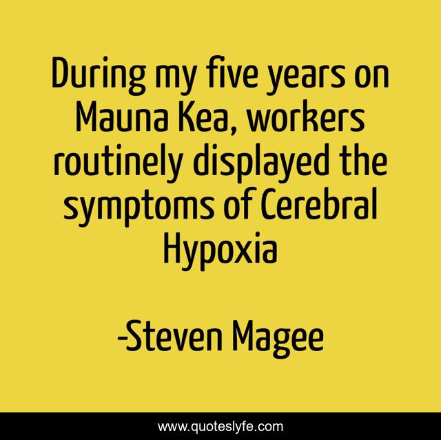 This page presents the quote "During my five years on Mauna Kea, workers routinely displayed the symptoms of Cerebral Hypoxia". Author of this quote is Steven Magee. This quote is about dol, sickness, cerebral, sickness-and-diseases, sickness-of-the-mind, safe, worker, sickness-and-health, kea,.
