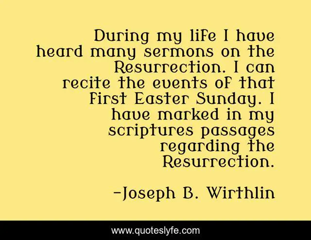 This page presents the quote "During my life I have heard many sermons on the Resurrection. I can recite the events of that first Easter Sunday. I have marked in my scriptures passages regarding the Resurrection.". Author of this quote is Joseph B. Wirthlin. This quote is about life, my life, i can,.