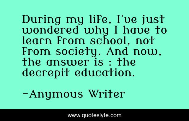 This page presents the quote "During my life, I've just wondered why I have to learn from school, not from society. And now, the answer is : the decrepit education.". Author of this quote is Anymous Writer. This quote is about life, education,.