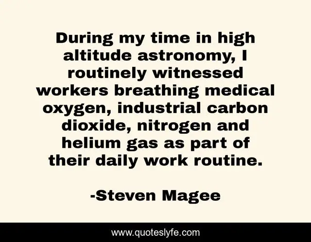 This page presents the quote "During my time in high altitude astronomy, I routinely witnessed workers breathing medical oxygen, industrial carbon dioxide, nitrogen and helium gas as part of their daily work routine.". Author of this quote is Steven Magee. This quote is about industrial, astronomical, high, astronomer, nitrogen, during, astrobiology, helium, witnessed,.