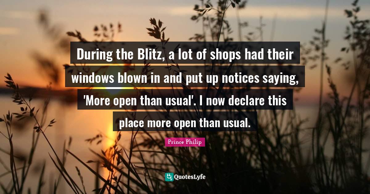 This page presents the quote "During the Blitz, a lot of shops had their windows blown in and put up notices saying, 'More open than usual'. I now declare this place more open than usual.". Author of this quote is Prince Philip. This quote is about window, classic, blitz, usual, shops,.