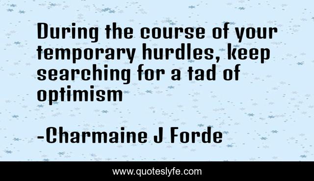 This page presents the quote "During the course of your temporary hurdles, keep searching for a tad of optimism". Author of this quote is Charmaine J Forde. This quote is about hurdles, temporary, searching, optimism, tad, course,.