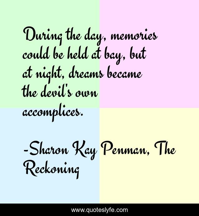 This page presents the quote "During the day, memories could be held at bay, but at night, dreams became the devil's own accomplices.". Author of this quote is Sharon Kay Penman, The Reckoning. This quote is about nightmares, memories, princes, dreams, wales,.
