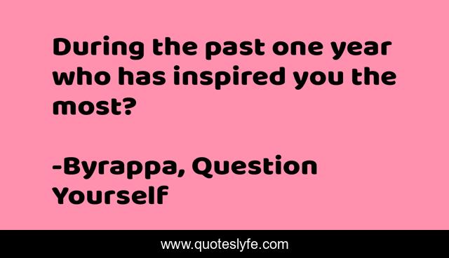This page presents the quote "During the past one year who has inspired you the most?". Author of this quote is Byrappa, Question Yourself. This quote is about life, inspired, past-year, question, question-yourself, questions, year, yourself,.
