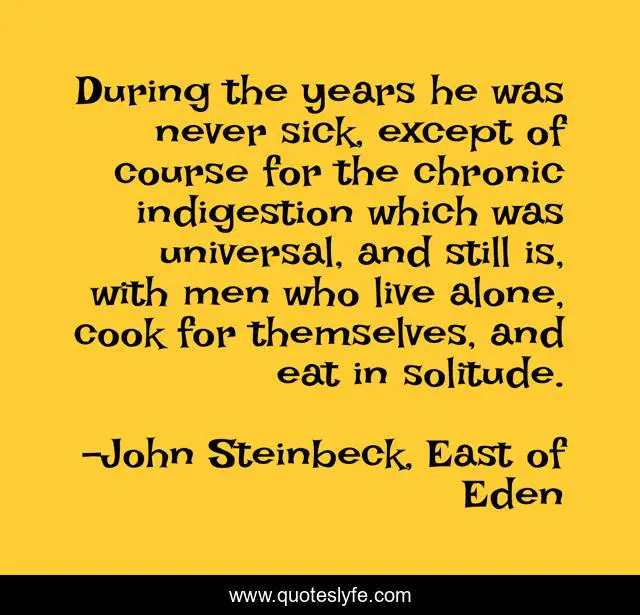 This page presents the quote "During the years he was never sick, except of course for the chronic indigestion which was universal, and still is, with men who live alone, cook for themselves, and eat in solitude.". Author of this quote is John Steinbeck, East of Eden. This quote is about men, bachelors, diet,.