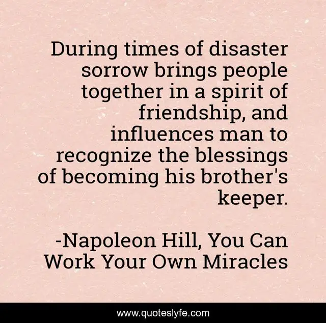 This page presents the quote "During times of disaster sorrow brings people together in a spirit of friendship, and influences man to recognize the blessings of becoming his brother's keeper.". Author of this quote is Napoleon Hill, You Can Work Your Own Miracles. This quote is about sorrow, brotherhood, friendship, disaster, wisdom,.