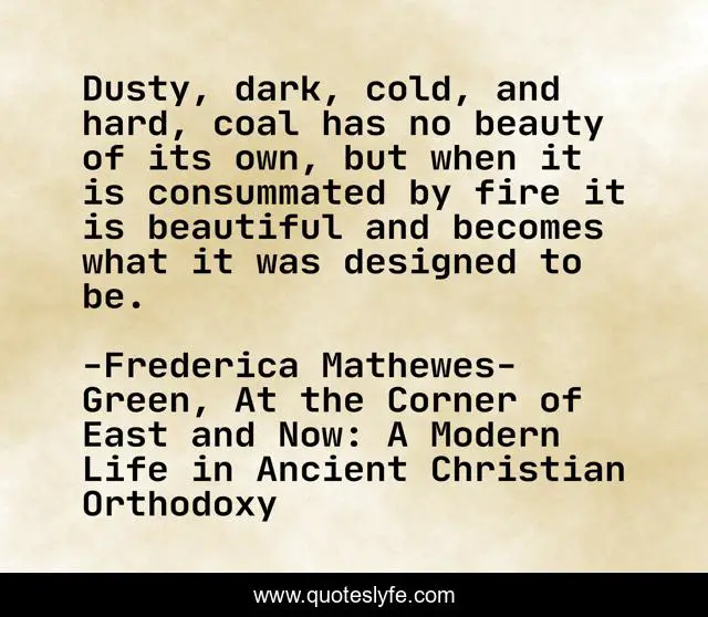 "Frederica Mathewes-Green, At the Corner of East and Now: A Modern Life in Ancient Christian Orthodoxy Quotes." Quoteslyfe.com, 2025. Sat. 06 Dec. 2025. <https://www.quoteslyfe.com/quote/Dusty-dark-cold-and-hard-coal-has-25848>.