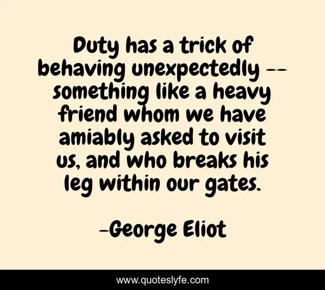 This page presents the quote "Duty has a trick of behaving unexpectedly -- something like a heavy friend whom we have amiably asked to visit us, and who breaks his leg within our gates.". Author of this quote is George Eliot. This quote is about friendship, life, humor, wisdom,.