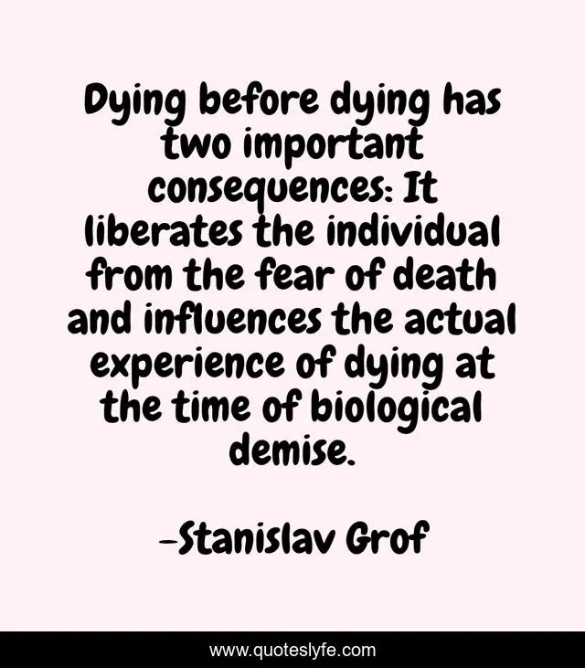 This page presents the quote "Dying before dying has two important consequences: It liberates the individual from the fear of death and influences the actual experience of dying at the time of biological demise.". Author of this quote is Stanislav Grof. This quote is about fear, experience, time,.