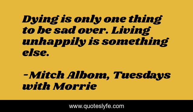 This page presents the quote "Dying is only one thing to be sad over. Living unhappily is something else.". Author of this quote is Mitch Albom, Tuesdays with Morrie. This quote is about life, death,.