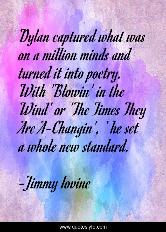 This page presents the quote "Dylan captured what was on a million minds and turned it into poetry. With 'Blowin' in the Wind' or 'The Times They Are A-Changin', ' he set a whole new standard.". Author of this quote is Jimmy Iovine. This quote is about new, wind, minds,.
