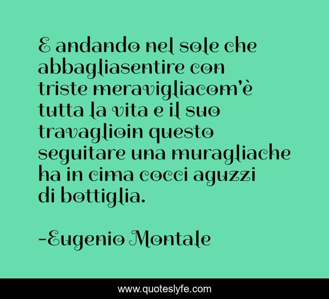 This page presents the quote "E andando nel sole che abbagliasentire con triste meravigliacom'è tutta la vita e il suo travaglioin questo seguitare una muragliache ha in cima cocci aguzzi di bottiglia.". Author of this quote is Eugenio Montale. .