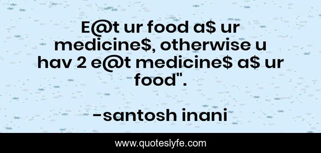 This page presents the quote "E@t ur food a$ ur medicine$, otherwise u hav 2 e@t medicine$ a$ ur food".". Author of this quote is santosh inani. This quote is about food, etc, life, medicine, eat,.