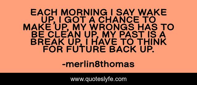This page presents the quote "EACH MORNING I SAY WAKE UP, I GOT A CHANCE TO MAKE UP, MY WRONGS HAS TO BE CLEAN UP, MY PAST IS A BREAK UP, I HAVE TO THINK FOR FUTURE BACK UP.". Author of this quote is merlin8thomas. This quote is about break-up, past, wake-up, chance, future, make-up,.