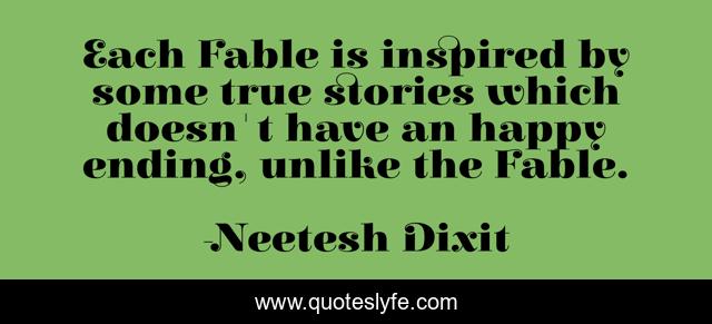 This page presents the quote "Each Fable is inspired by some true stories which doesn't have an happy ending, unlike the Fable.". Author of this quote is Neetesh Dixit. This quote is about distance, life, love, betrayal, hurt, relation, fiction, affection, inspiration,.