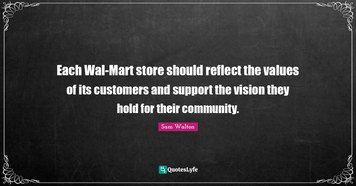 This page presents the quote "Each Wal-Mart store should reflect the values of its customers and support the vision they hold for their community.". Author of this quote is Sam Walton. This quote is about commitment, community, support, vision, business, values, educational, customers,.
