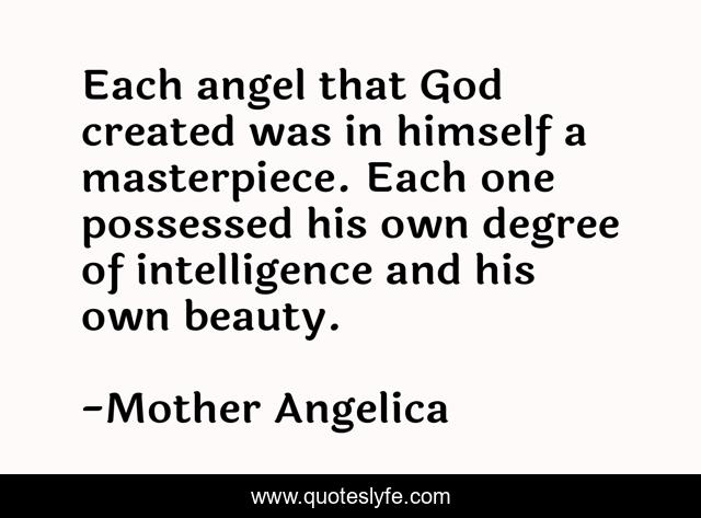 This page presents the quote "Each angel that God created was in himself a masterpiece. Each one possessed his own degree of intelligence and his own beauty.". Author of this quote is Mother Angelica. This quote is about god, beauty, angel,.