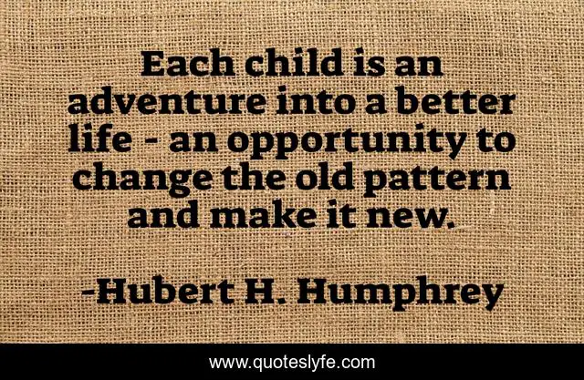This page presents the quote "Each child is an adventure into a better life - an opportunity to change the old pattern and make it new.". Author of this quote is Hubert H. Humphrey. This quote is about life, opportunity, adventure,.