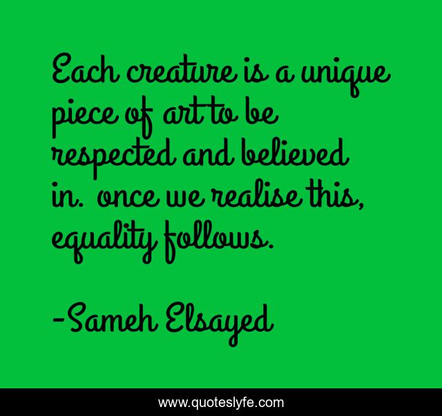 This page presents the quote "Each creature is a unique piece of art to be respected and believed in. once we realise this, equality follows.". Author of this quote is Sameh Elsayed. This quote is about experience-plus, believe, equality, art, adam-elsayedtood, organizational-development, joumana-ezz, piece-of-art, noha-abdel-hameed,.