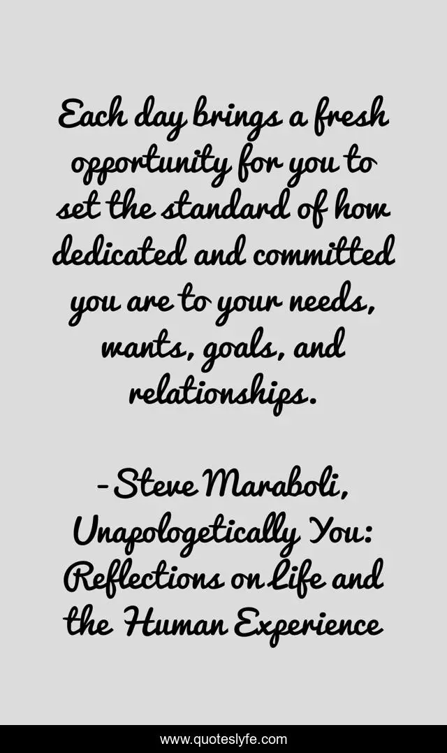 This page presents the quote "Each day brings a fresh opportunity for you to set the standard of how dedicated and committed you are to your needs, wants, goals, and relationships.". Author of this quote is Steve Maraboli, Unapologetically You: Reflections on Life and the Human Experience. This quote is about relationships, wants, needs, commitment, standard, goals, dedication, opportunity,.