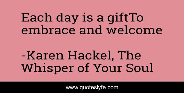 This page presents the quote "Each day is a giftTo embrace and welcome". Author of this quote is Karen Hackel, The Whisper of Your Soul. This quote is about faith, the-present, inspirational, living-life-to-the-full, enthusiasm, new-age, inspiration,.