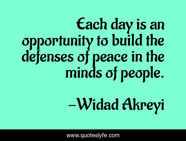 This page presents the quote "Each day is an opportunity to build the defenses of peace in the minds of people.". Author of this quote is Widad Akreyi. This quote is about peace, war,.