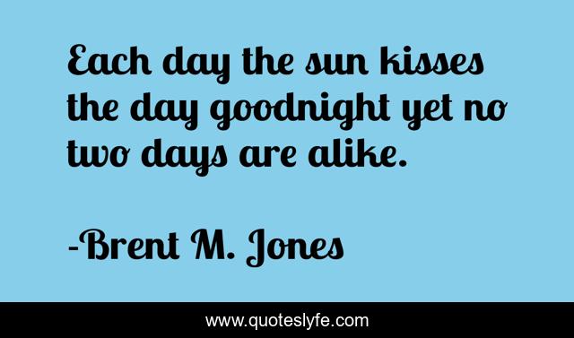 This page presents the quote "Each day the sun kisses the day goodnight yet no two days are alike.". Author of this quote is Brent M. Jones. This quote is about sun, goodnight, sun-kisses, days-alike,.
