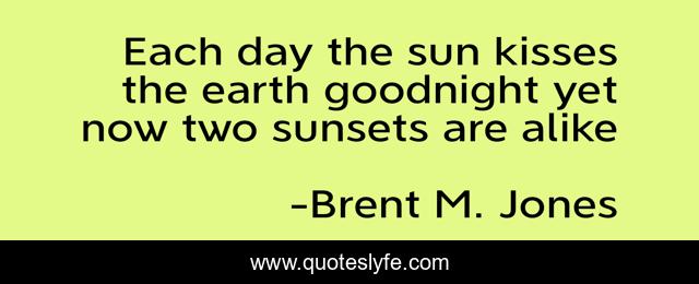 This page presents the quote "Each day the sun kisses the earth goodnight yet now two sunsets are alike". Author of this quote is Brent M. Jones. This quote is about sun, sunsets, sun-kisses, earth-goodnight,.