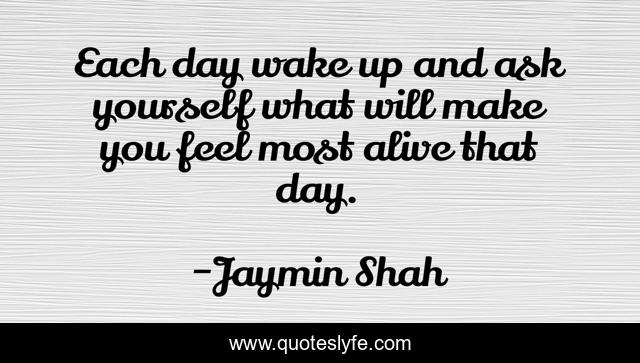 This page presents the quote "Each day wake up and ask yourself what will make you feel most alive that day.". Author of this quote is Jaymin Shah. This quote is about confidence, inspirational, success, work, life, experience, failure, courage, life-lessons,.