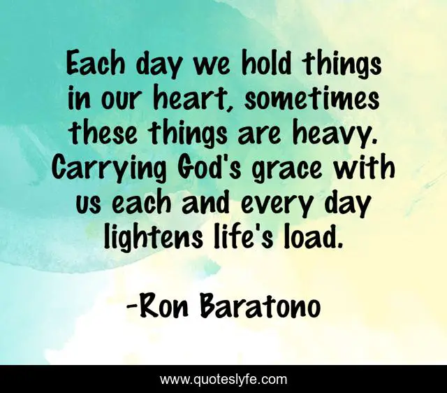 This page presents the quote "Each day we hold things in our heart, sometimes these things are heavy. Carrying God's grace with us each and every day lightens life's load.". Author of this quote is Ron Baratono. This quote is about god, life, heart,.