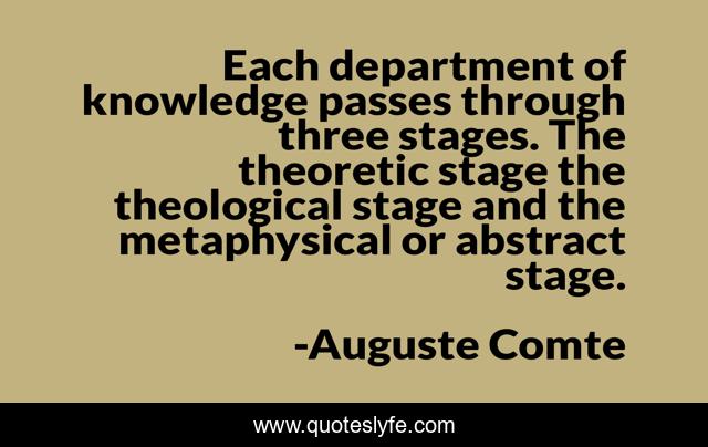 This page presents the quote "Each department of knowledge passes through three stages. The theoretic stage the theological stage and the metaphysical or abstract stage.". Author of this quote is Auguste Comte. This quote is about abstract, through, three,.