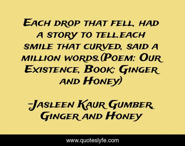 This page presents the quote "Each drop that fell, had a story to tell.each smile that curved, said a million words.(Poem: Our Existence, Book: Ginger and Honey)". Author of this quote is Jasleen Kaur Gumber, Ginger and Honey. This quote is about love, meaning, emotions, tears, affection, smile, happiness,.