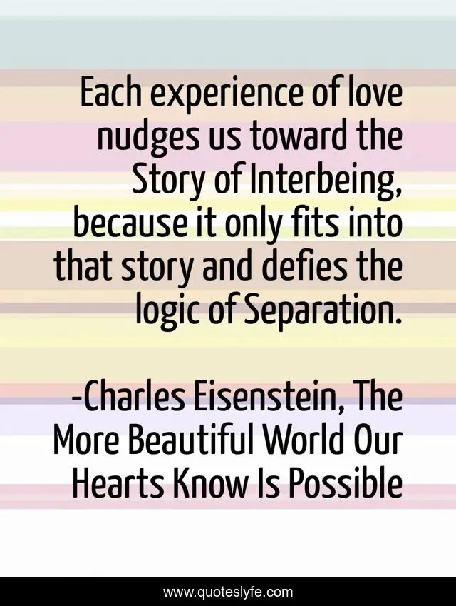 This page presents the quote "Each experience of love nudges us toward the Story of Interbeing, because it only fits into that story and defies the logic of Separation.". Author of this quote is Charles Eisenstein, The More Beautiful World Our Hearts Know Is Possible. This quote is about interbeing, love, activism, sacred-wisdom, sacred-teachings, humanity, affection,.