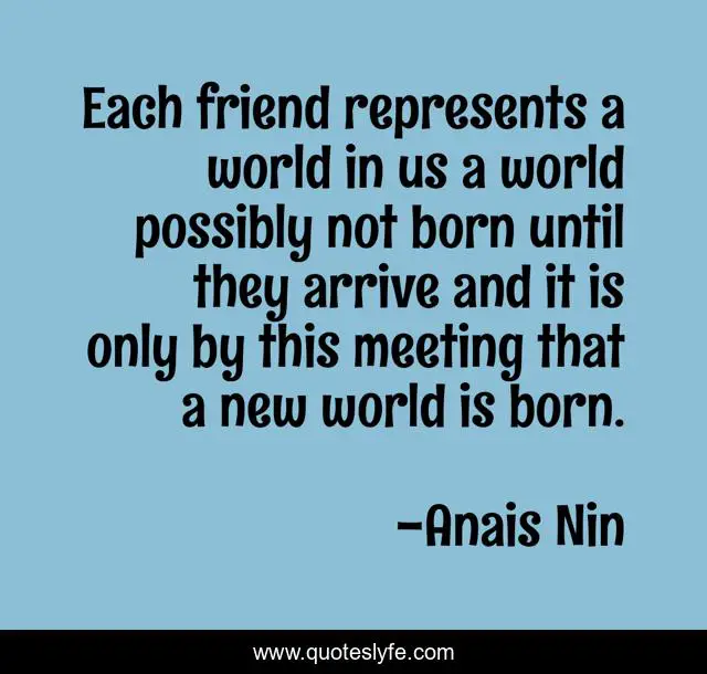 "Anais Nin Quotes." Quoteslyfe.com, 2025. Fri. 05 Dec. 2025. <https://www.quoteslyfe.com/quote/Each-friend-represents-a-world-in-us-265753>.